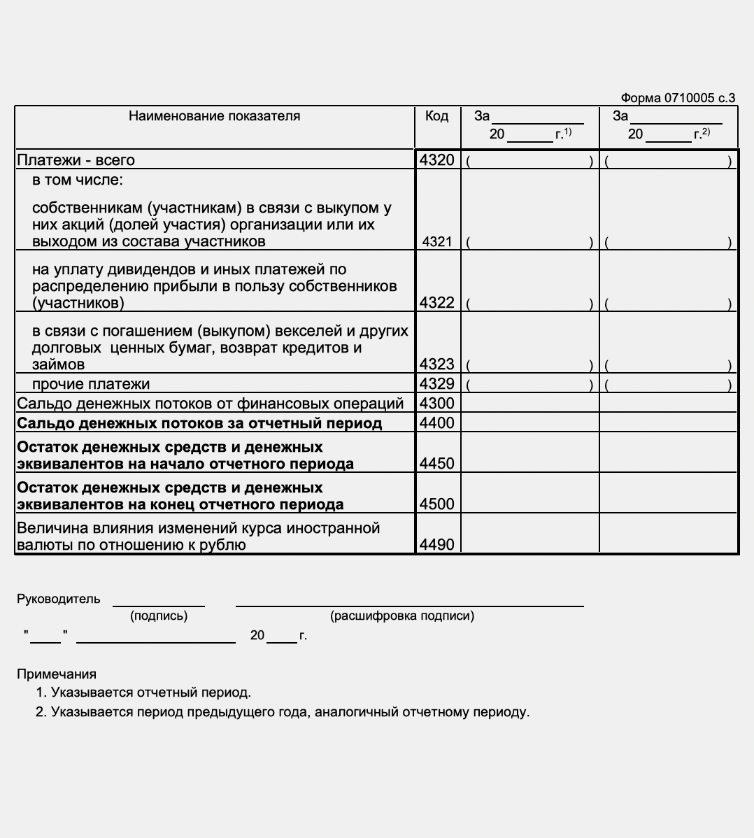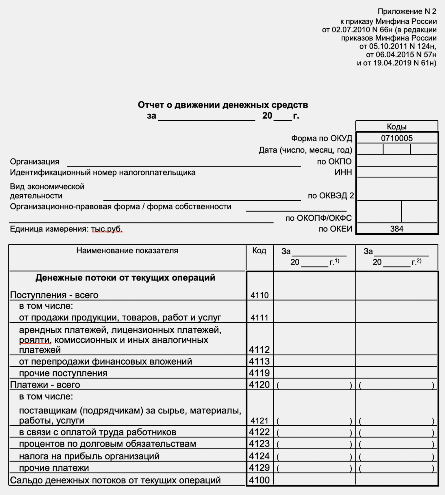 Бланк формы отчёта о движении денежных средств — таблица с показателями, над которой приведены: