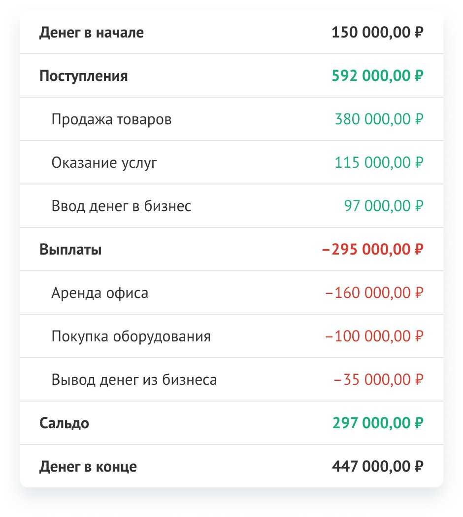 Показатели отчёта — поступления денег и выплаты — сгруппированы в три раздела по типам деятельности компании: