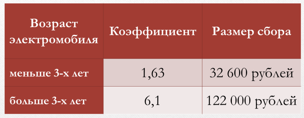 Для юридических лиц и индивидуальных предпринимателей все немного сложнее и значительно дороже. Тут учитывается не только возраст автомобиля, но и объем двигателя. Например, на электромобили без двигателя внутреннего сгорания таблица коэффициентов выглядит так: