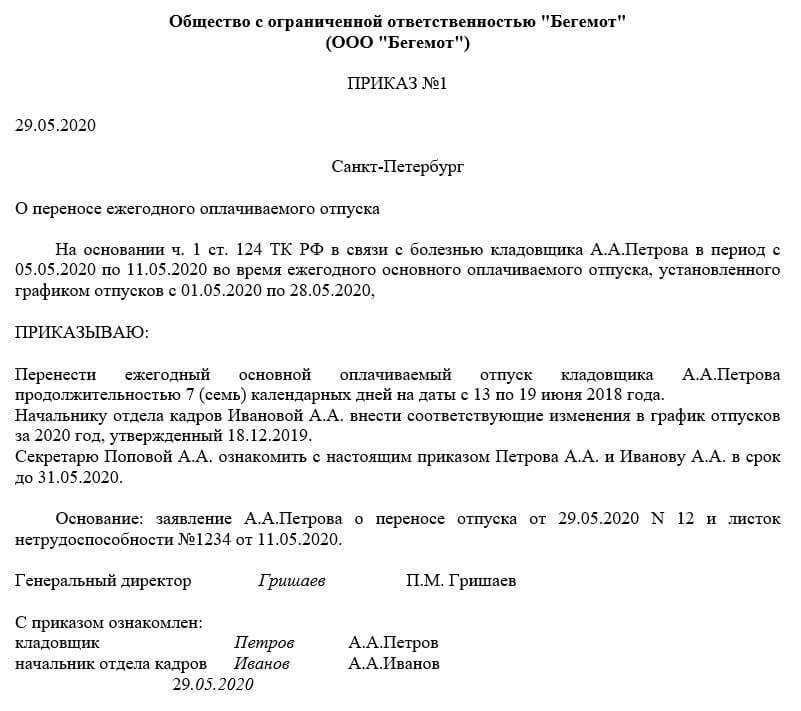 На основе больничного листа и полученного от работника заявления, его начальник издает приказ о переносе.