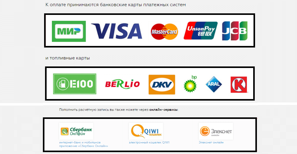 Используя реквизиты вашей регистрации, можно переводить деньги банковским переводом, банковской картой через банкомат или оператора в банке. Банки берут процент за перевод средств, уточняйте его размер. Для оплаты подходят топливные карты E100 и DKV.