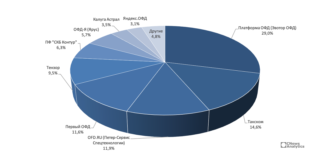 В категорию «Другие», на долю которой приходится 4,8% рынка, входят «Тандер», «ИнитПро», «Группа Элемент», «Энвижн Груп», «Вымпел-Коммуникации», «Мультикарта», «Дримкас», «Электронный экспресс», «Корус Консалтинг СНГ», ОФД «Онлайн» и «Информационный центр».