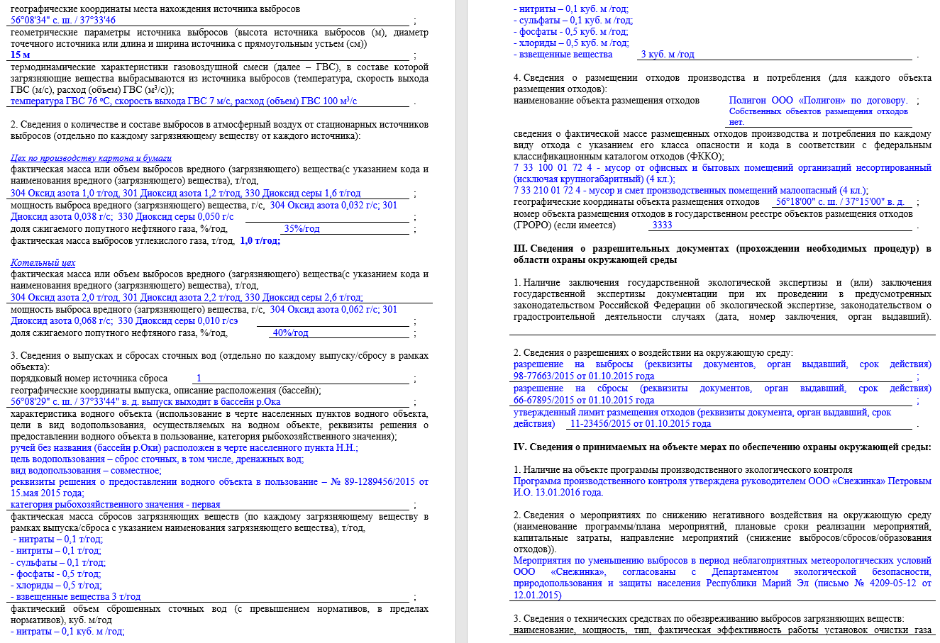 - Сведения о разрешительных документах (прохождении необходимых процедур) природопользователя в области охраны окружающей среды.