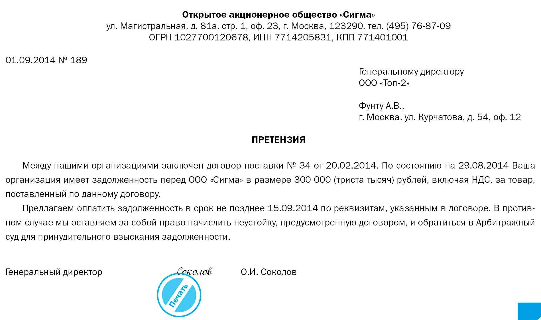 Скачать пустой бланк письма-претензии. При этом важнейшим условием является то, чтобы составитель письма имел представление о гражданско-правовых отношениях и прочих нормах законодательства РФ и умел грамотно использовать их при написании претензий. Правила составления письма Письмо-претензия не имеет стандартного унифицированного образца, обязательного к применению. Оно может составляться в свободном виде или по разработанному внутри предприятия шаблону. Тем не менее, существует ряд правил, которые в любом случае необходимо соблюдать в процессе его написания. Письмо-претензия всегда должно включать в себя сведения об отправителе и адресате если речь идет о юридических лицах, здесь надо указывать их полные наименования, а также, — касаемо адресата, — должность и ФИО лица, для которого оно предназначено ; причины его написания со ссылками на пункты договора, законы и пр. Если в письме приводятся какие-то суммы и сроки, их нужно вписывать как цифрами, так и прописью.