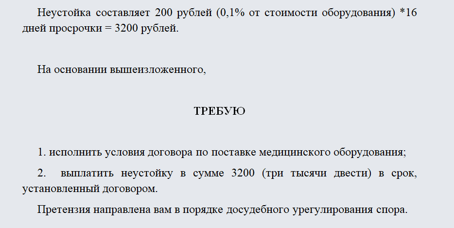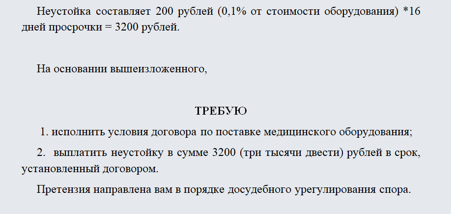 - собственно требования с указанием длительности просрочки и вычисленной по ней общей суммы просрочки. По желанию можно включить в текст и саму процедуру математического расчета;