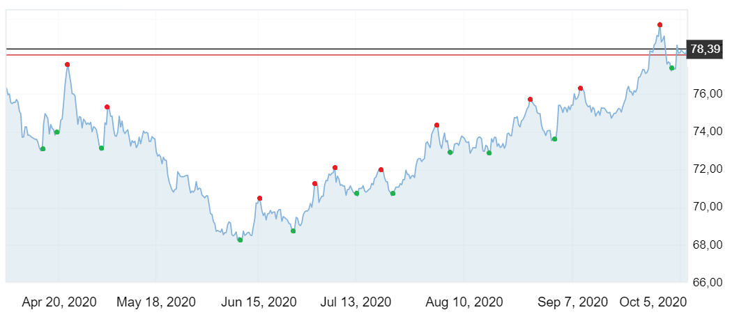 Чтобы заработать на курсовой разнице, нужно стремиться к последовательности: купили валюту в зелёной точке, продали в красной. Идеально попасть в минимальные и максимальные точки вряд ли получится — для этого быть профессиональным трейдером. Но если вы будете покупать валюту на падении и продавать на росте, то сможете заработать.