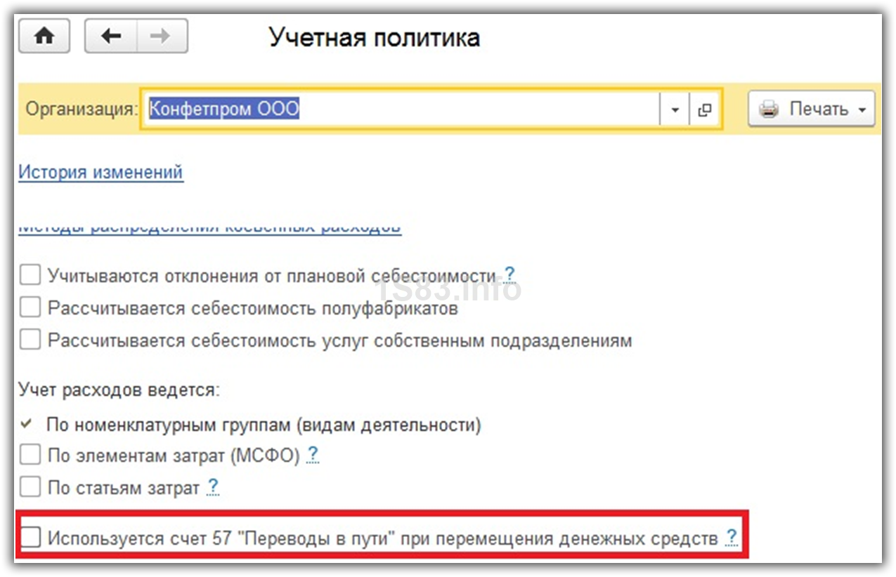 В открывшемся окне найдите пункт под названием «Используется счет 57 «Переводы в пути» при перемещении денежных средств» и отметьте го флагом. Данную надстройку не обязательно включать.