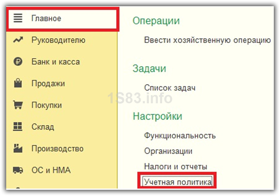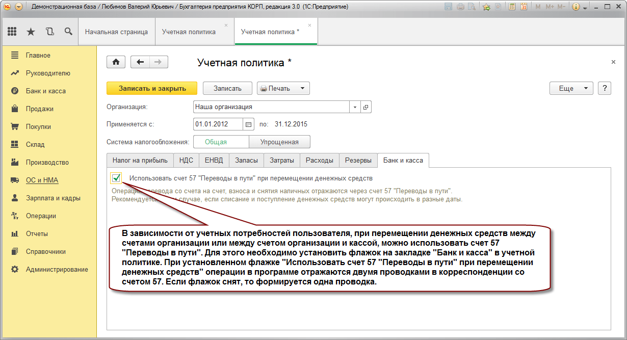 При осуществлении перевода длительностью более 1 дня с валютного и рублевого счета нужно применять 57 счет «Переводы в пути». При переводе в течение дня нужно применять счёт 76.09 «Прочие расчеты с разными дебиторами и кредиторами». Теперь нужно открыть список учетных политик организаций. Данный список находится в меню «Главное» в разделе «Настройки» пункт «Учетная политика». В открывшемся окне откройте вкладку «Банк и касса» и установите галочку напротив пункта «Использовать счет 57 «Переводы в пути» при перемещении денежных средств».