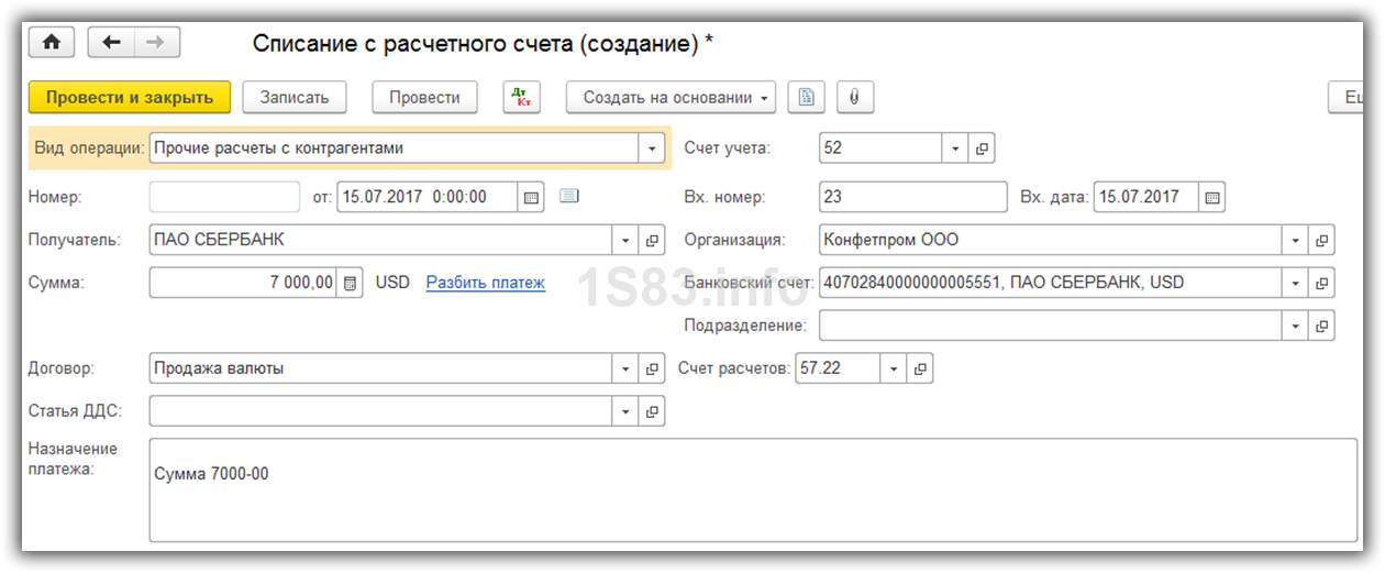Рассмотрим пример, когда нашей организации необходимо продать 7000$ Сбербанку за рубли. Первоначально в 1С создается платежное поручение и на его основании списание с расчетного счета. Само платежное поручение мы рассматривать не будем, и сразу перейдем к оформлению списания, так как именно оно совершает необходимые проводки.
