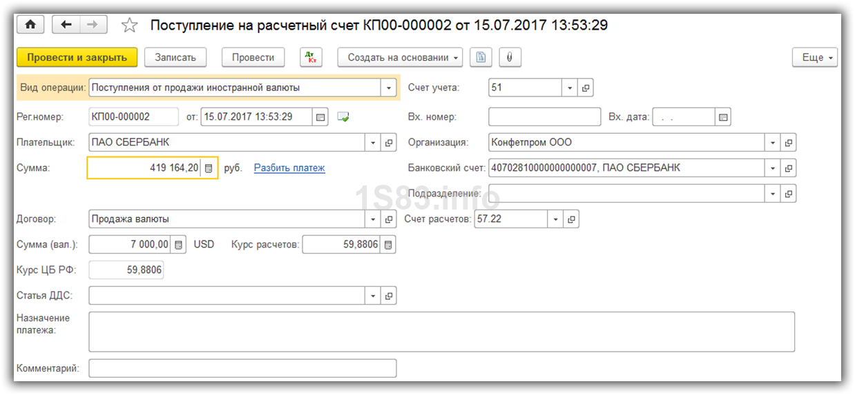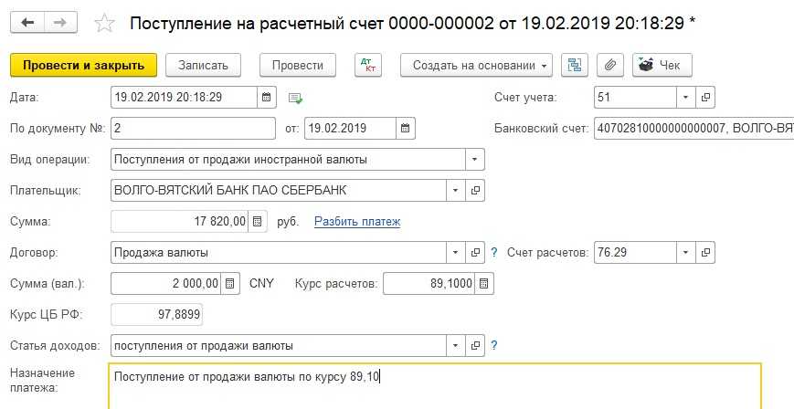 - Тип операции — «Поступление от продажи иностранной валюты»;