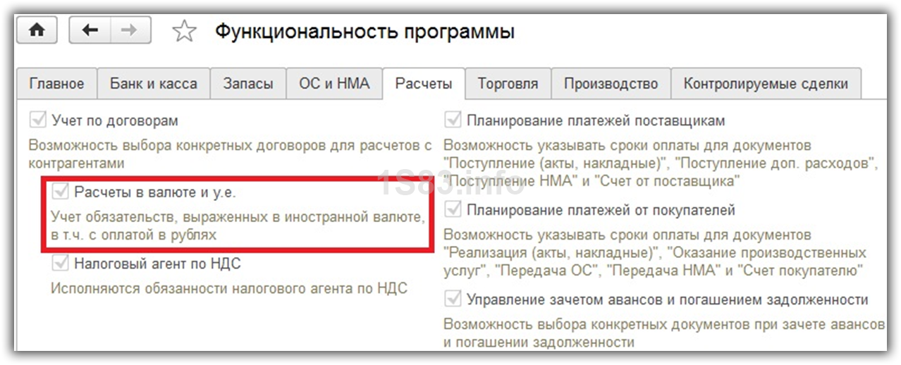 Так же рекомендуется проверить установку еще одной надстройки. В меню «Администрирование» выберите пункт «Функциональность». В появившемся окне настройки откройте закладку «Расчеты» и проверьте, установлен ли флаг на пункте «Расчеты в валюте и у.е.». У нас он уже был установлен по умолчанию.