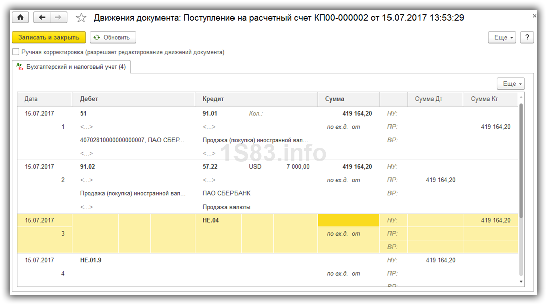 В случае, если валюта изменила свою стоимость с момента последней валютной операции, в 1С добавится еще и проводка по расчету переоценки валютных остатков (если переоценка настроена).
