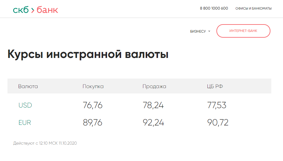 Так выглядят курсы доллара и евро на сайте «СКБ-Банка». Скриншот за 10.10.2020. Курс обновляется примерно каждый час или после резких изменений на бирже.