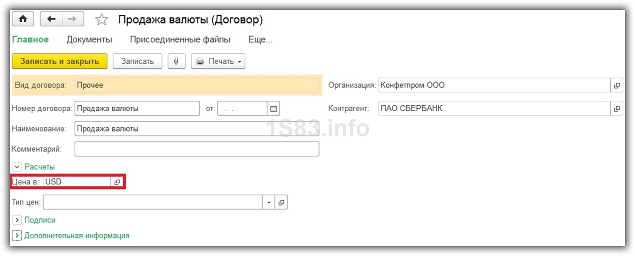В качестве вида операции укажите «Прочие расчеты с контрагентами». Получателем в нашем случае является ПАО Сбербанк. С ним у нас уже заключен договор с расчетами в USD. Он выбирается в карточке данного документа. На рисунке ниже отображена карточка этого договора.