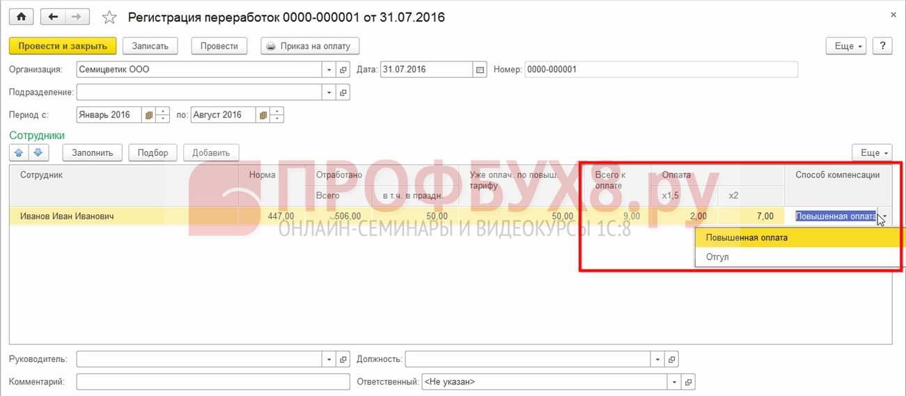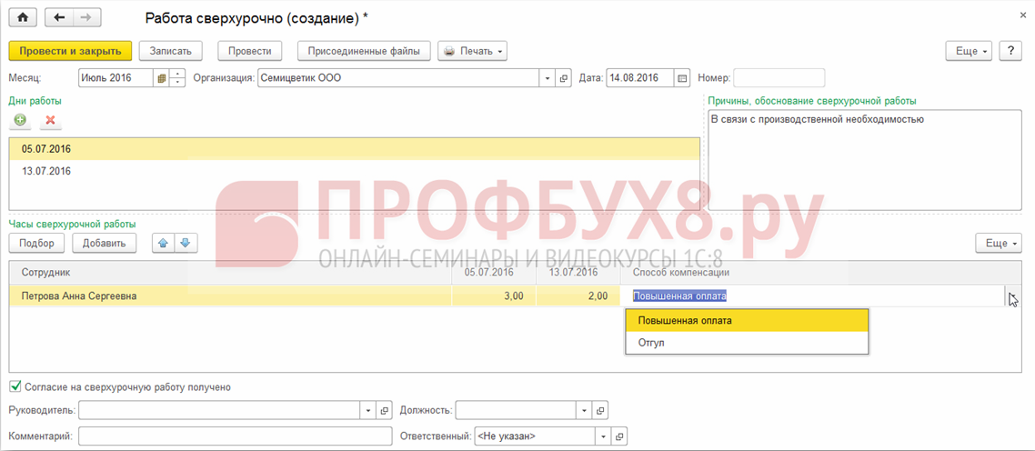 - Способ компенсации – выбирается из двух значений: отгул или повышенная оплата:
