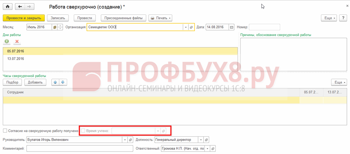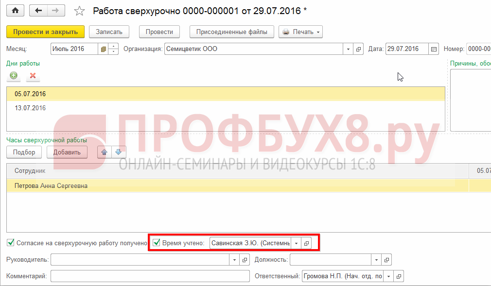 В данном случае кадровик создает и заполняет документ Работа сверхурочно. При этом флаг Время учтено недоступен: