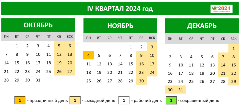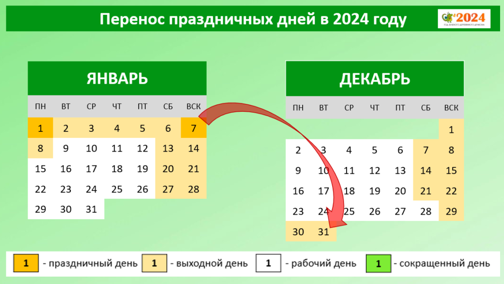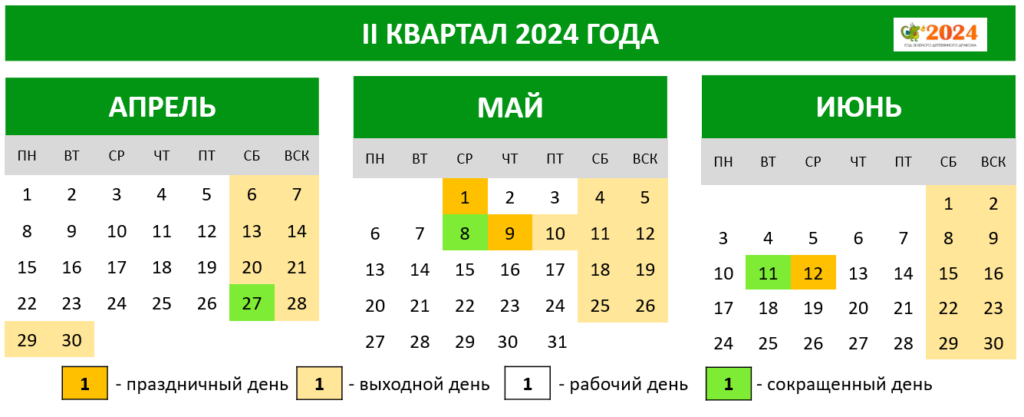 В 2024 году в России будет шестидневная производственная неделя, когда рабочий день приходится на субботу, а выходной день — на воскресенье. Кроме того, календарь 2024 года предоставляет несколько дополнительных выходных дней в связи с государственными праздниками и праздниками гражданского календаря.