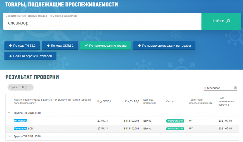 Сервис удобен тем, что проверку сделать можно не только по коду ТН ВЭД, ОКПД 2, но и по наименованию товара.
