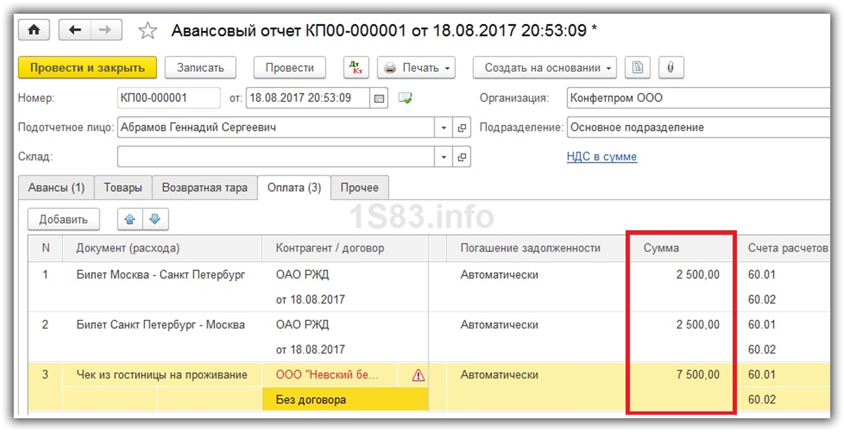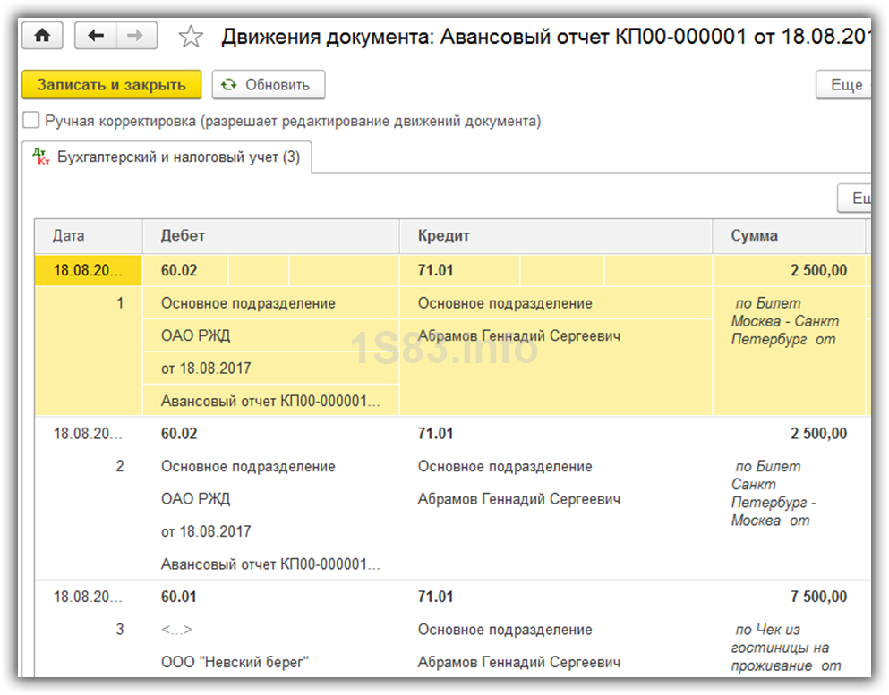 В нашем случае сотрудник предоставил в бухгалтерии два билета и чек за проживание в гостинице. Общая сумма составила 12 500 рублей. После проведения документа в 1С долг перед нашей организацией будет уменьшен только на эту сумму. Посмотрим на проводки:
