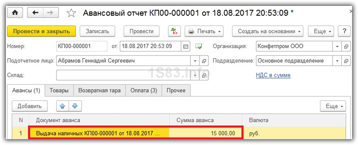 Шапку документа заполним стандартно, как это делали ранее. На закладке «Авансы» в табличной части добавим строку и выберем созданный ранее документ выдачи наличных. Как вы моете заметить, 1С 8.3 позволяет отчитываться сразу по нескольким авансам, выданным одному и тому же сотруднику. Делается это при помощи добавления в данную табличную часть дополнительных строк.