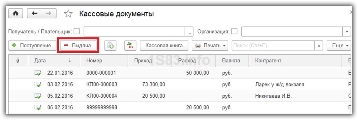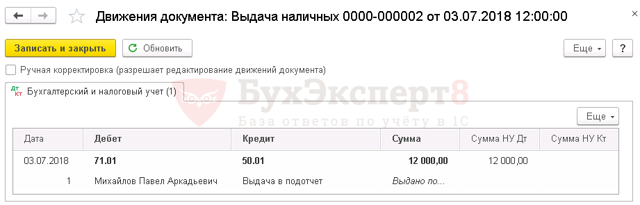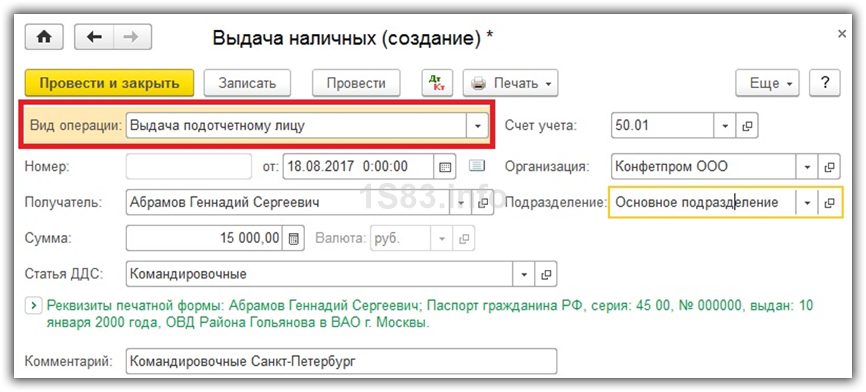 Рассмотрим особенности заполнения документа Выдача наличных по нашему примеру.