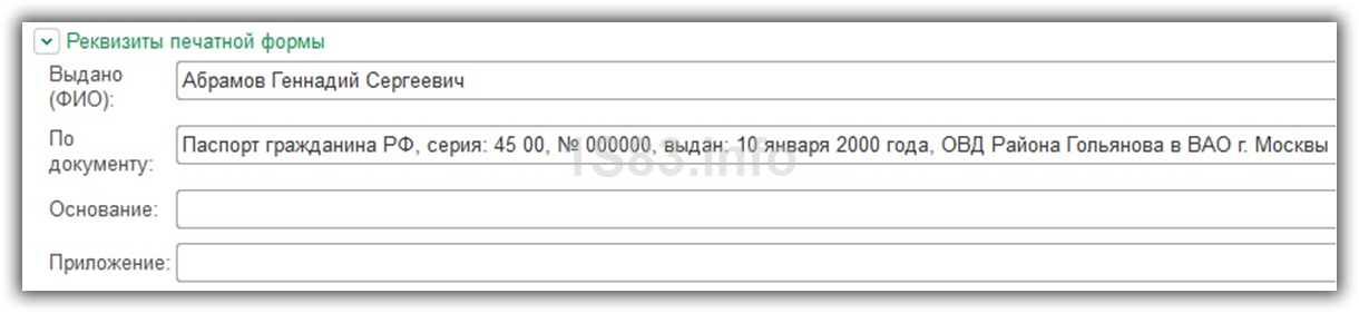 - Приложение — данные распорядительного документа или заявления сотрудника на выдачу денежных средств.
