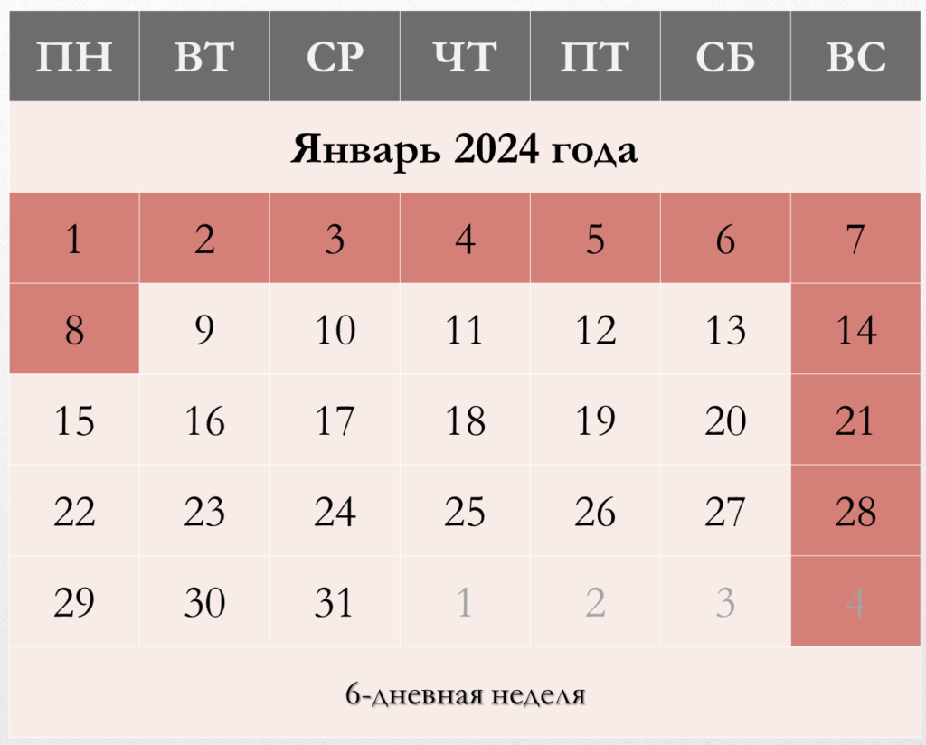 Если человек работает по графику 6-дневной недели, то он обычно выходит на работу по 7 часов с понедельника по пятницу и еще на 5 часов в субботу. Но из-за того, что суббота уже не считается выходным, производственный календарь будет иным. Сколько отдыхаем в январе 2024 года на шестидневной неделе:
