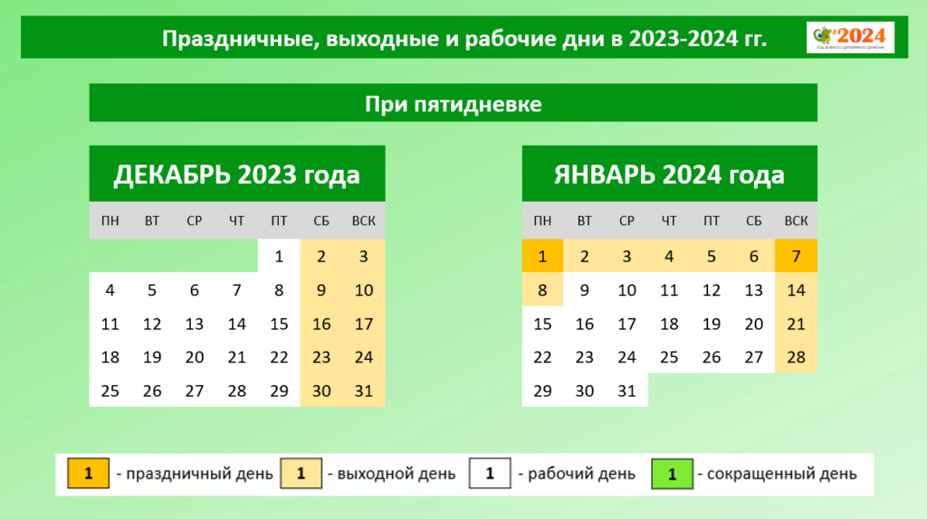Как видно, на январские каникулы–2024 будет одна полностью нерабочая неделя, и одна короткая рабочая – с 9 по 12 января. Затем график будет обычным – по 5 рабочих и 2 выходных дня в неделю.
