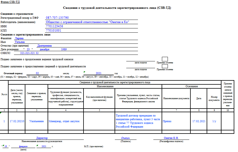 Посмотрите пример заполнения формы СЗВ-ТД при увольнении.