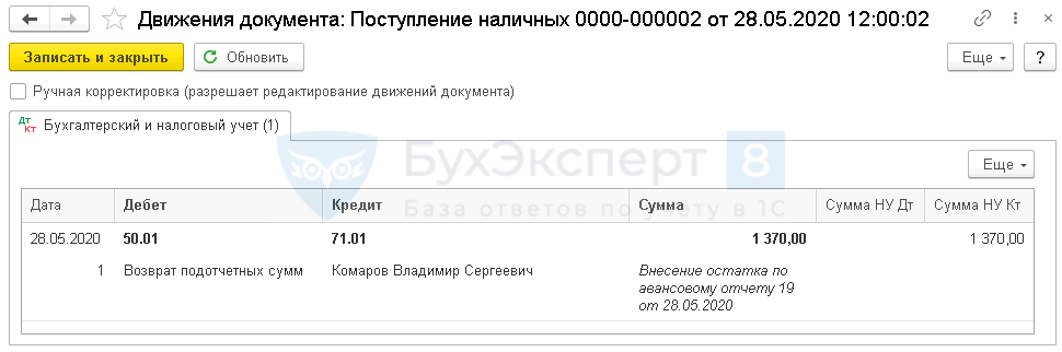 | 28 мая | 50.01 | 71.01 | 1 370 | 1 370 | Возврат подотчетных средств | Поступление наличных — Возврат от подотчетного лица | |