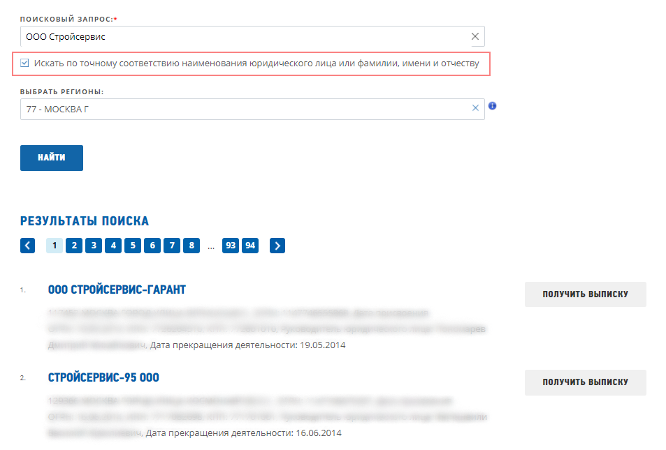 Например, на момент написания этой статьи, в ЕГРЮЛ только в Москве нашлось несколько сотен компаний, названия которых включают в себя слово «Стройсервис», в том числе недействующие. А если снять галочку с опции «Искать по точному соответствию наименования юрлица» (выделена на картинке красной рамкой), то программа найдет 2 199 360 записей.