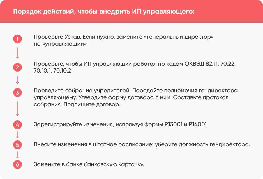 Если хотите внедрить ИП управляющего вместо гендиректора, рекомендуем такой порядок действий: