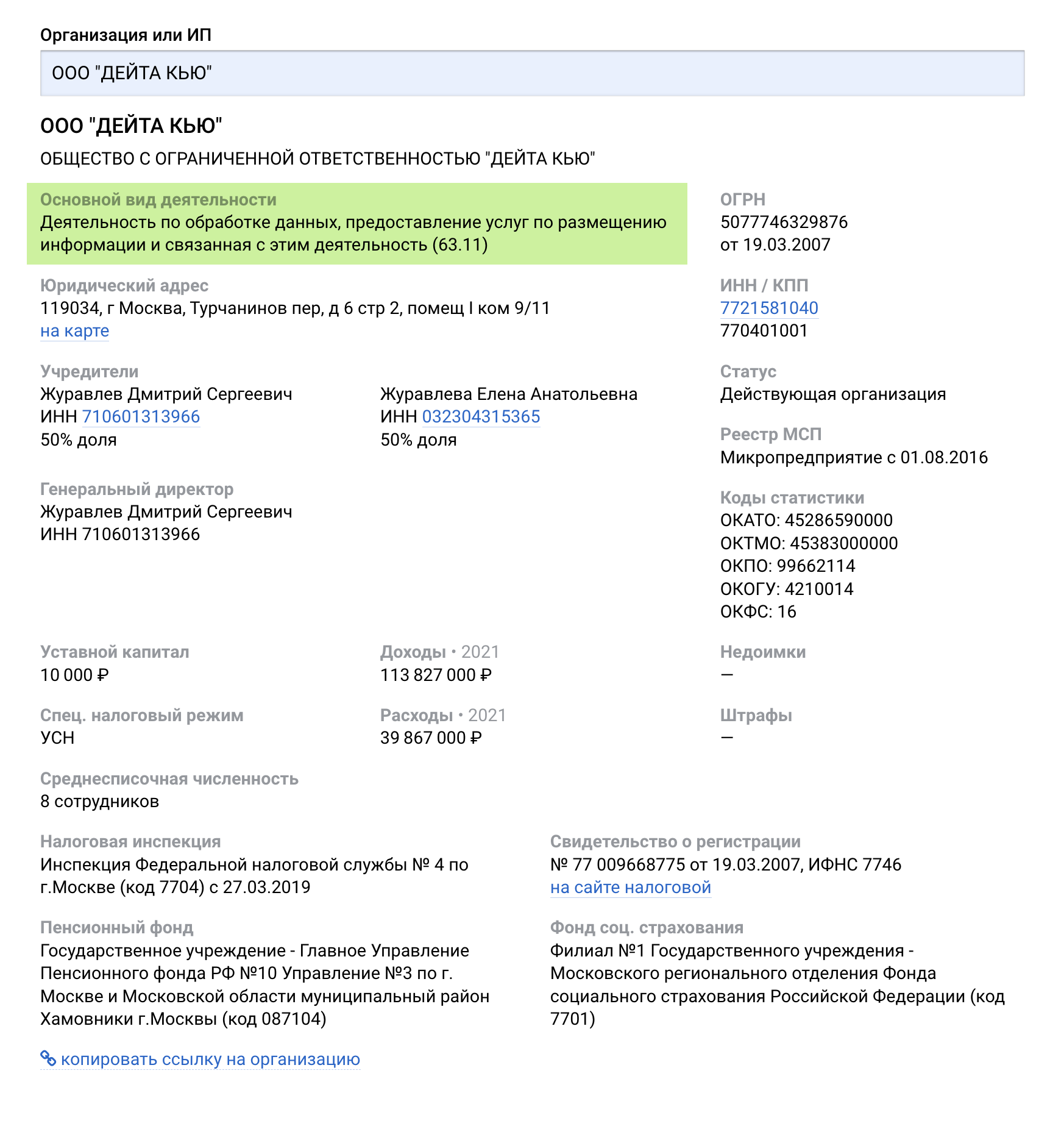 Вместе с кодами по общероссийскому классификатору видов деятельности «Дадата» вернет вагон сведений о юрлице. Например, реквизиты, учредителей, режим налогообложения, доходы и расходы