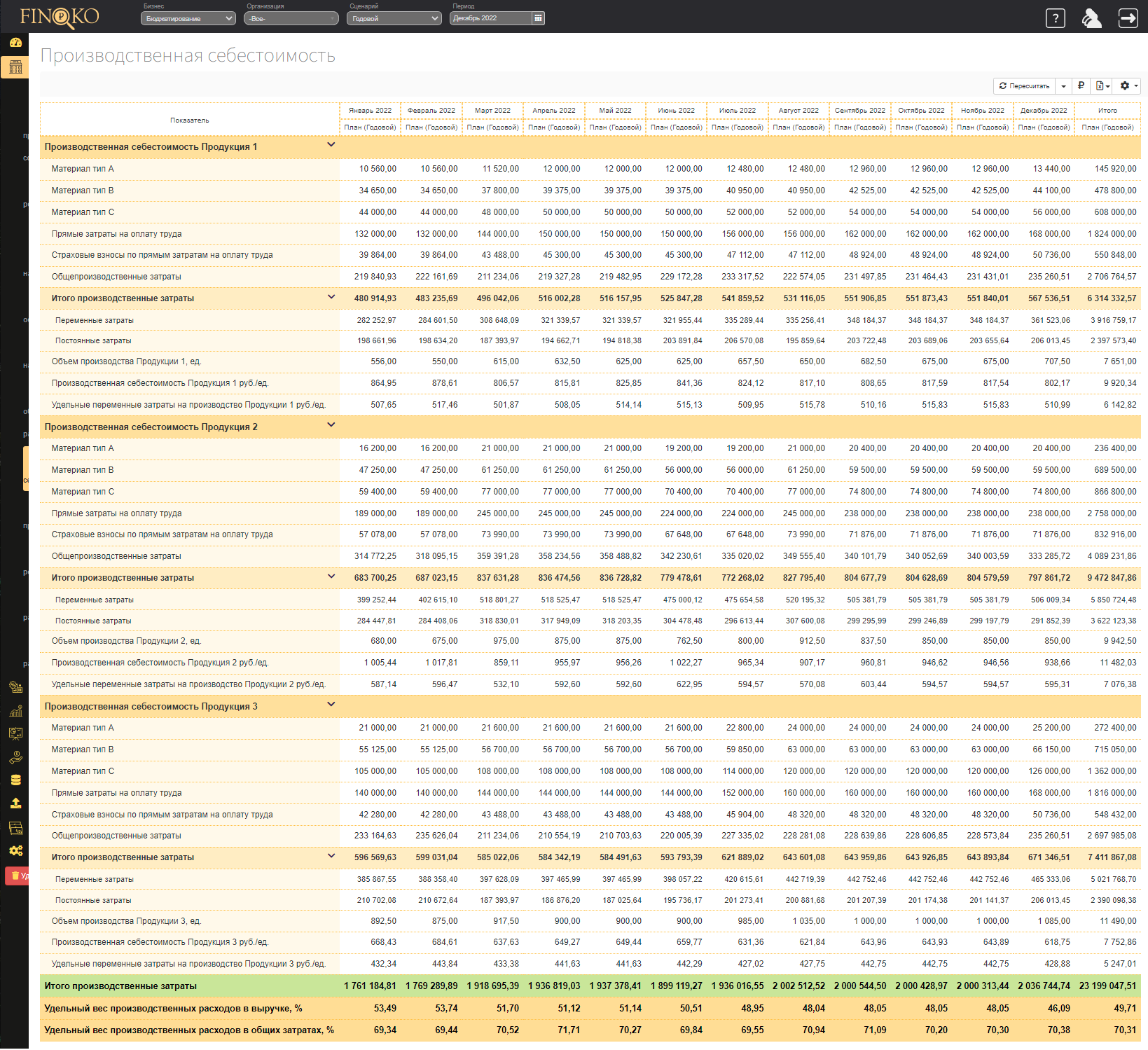 Как показывает анализ реальной практики, зачастую у организации могут возникать дополнительные статьи расходов, влияющие на себестоимость готовой продукции. Все зависит от специфики деятельности предприятия. На практике принято проводить анализ всех статей расходов с запланированной регулярностью. Если не контролировать расходы, они обязательно вырастут. Система Финоко позволяет установить лимиты (бюджеты) по всем статьям затрат