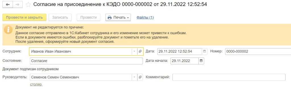 Рис. 5. Отправленный документ «Согласие на присоединение к КЭДО»