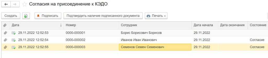 Рис. 4. Список «Согласия на присоединение к КЭДО»