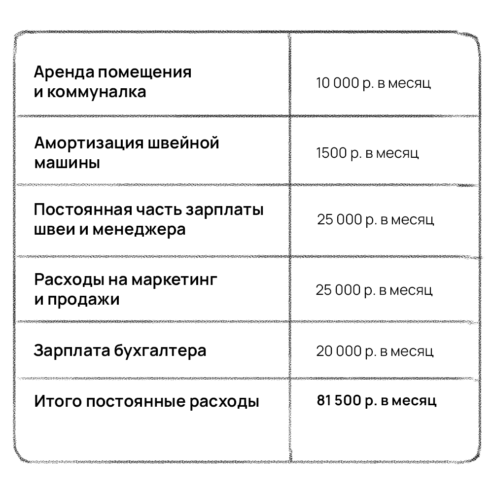 Но кроме этого есть еще и постоянные затраты. У фирмы из нашего примера есть еще офис, склад и мастерская, за аренду которых нужно платить. Есть сотрудники на окладе, расходы на охрану, оргтехнику и т.д. Все это никак не зависит от выручки. Даже если фирма не продаст ни одного стула, всё равно придётся платить аренду, зарплату и т.д.
