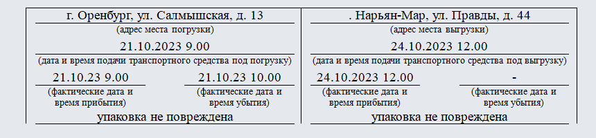 - информация о приемке груза (адрес, дата и время отгрузки, а также фактические дата, время прибытия и убытия ТС с грузом, фактическое состояние отгруженного товара, его масса и количество грузовых мест);