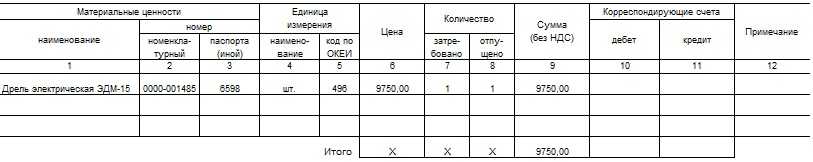Шаг 2. Затем в табличной части он отражает наименование передаваемых ТМЦ, номенклатурный номер, номер паспорта (или заводской номер) каждой единицы (при их наличии), количество передаваемых ТМЦ, их цену и сумму.