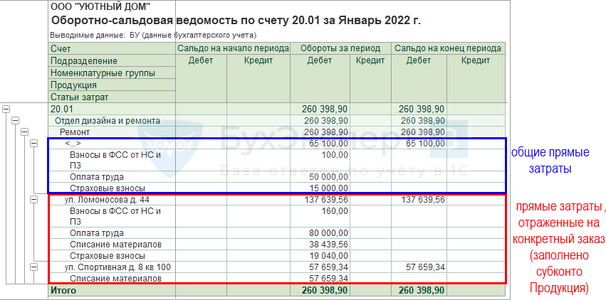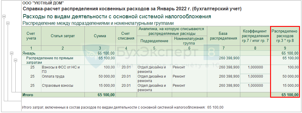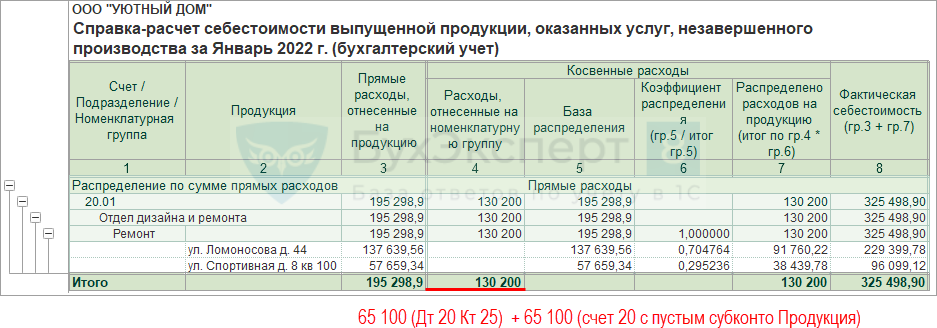 В примере прямые затраты отражены только по одному подразделению Отдел дизайна и ремонта и одной номенклатурной группе Ремонт. Косвенные затраты (65 000 руб.), отраженные на счете 25, распределились по данному Подразделению и Номенклатурной группе.