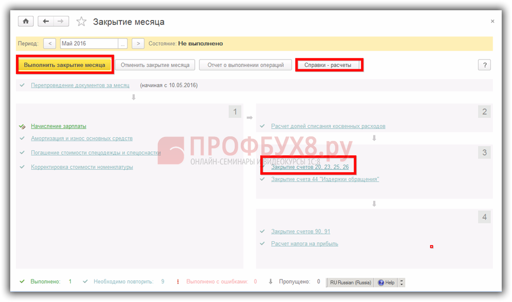 Выполним закрытие месяца в разделе Операции – Закрытие месяца – регламентная операция Закрытие счетов 20, 23, 25, 26.