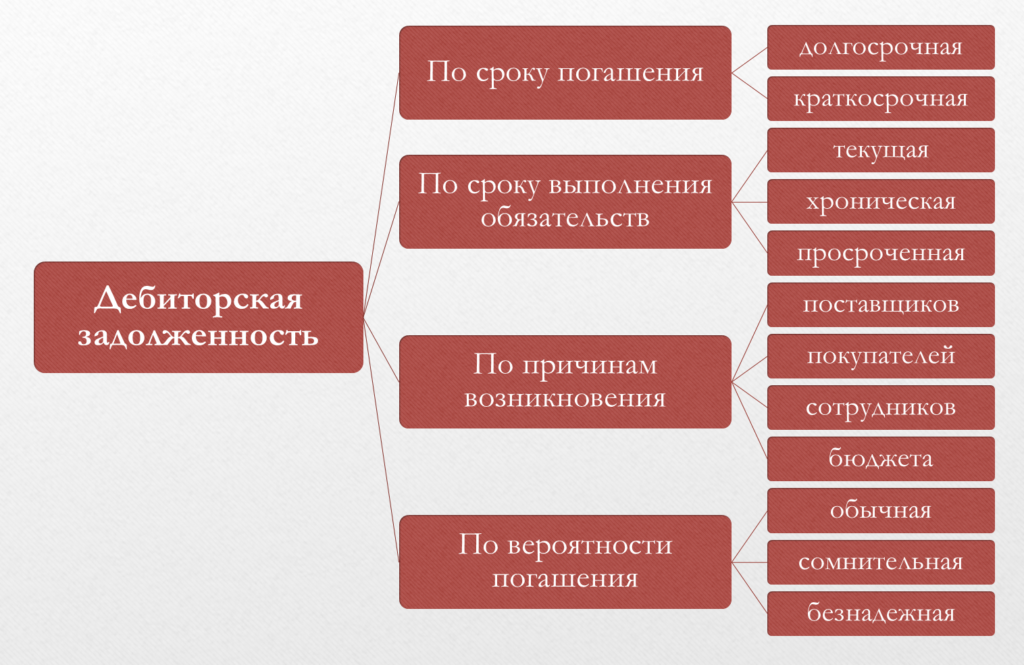 Виды дебиторской задолженности выделяют по четырём основным признакам: по основанию возникновения, по вероятности погашения, по срокам погашения и по срокам исполнения обязательств.