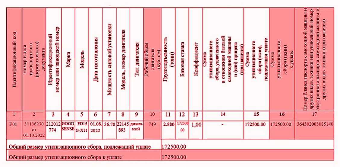 Графа 1: Идентификационный код — Указывается идентификационный код в соответствии с Перечнем видов и категории самоходных машин и прицепов к ним, в отношении которых уплачивается утилизационный сбор, а также размеров утилизационного сбора.