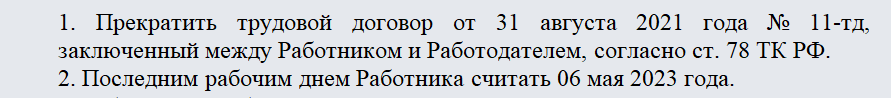 Следующим этапом закрепляется дата, по достижении которой заключенное трудовое соглашение будет расторгнуто, а работник — уволен.