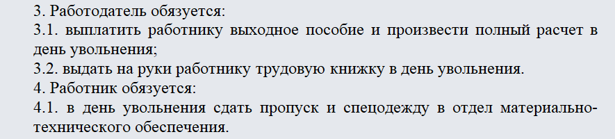 Затем необходимо перечислить те обязательства администрации компании, которые оно должно выполнить по отношению к работнику до момента увольнения. Сюда относятся, к примеру, выплатить зарплату, выходное пособие, выдать на руки все обязательные документы, и прочие условия, которые были достигнуты во время переговоров.