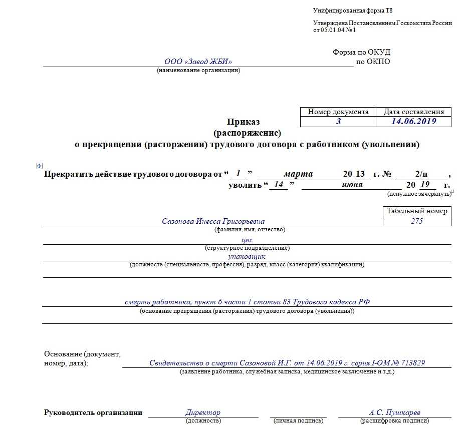- Причина увольнения труженика. В данном случае это будет смерть человека.