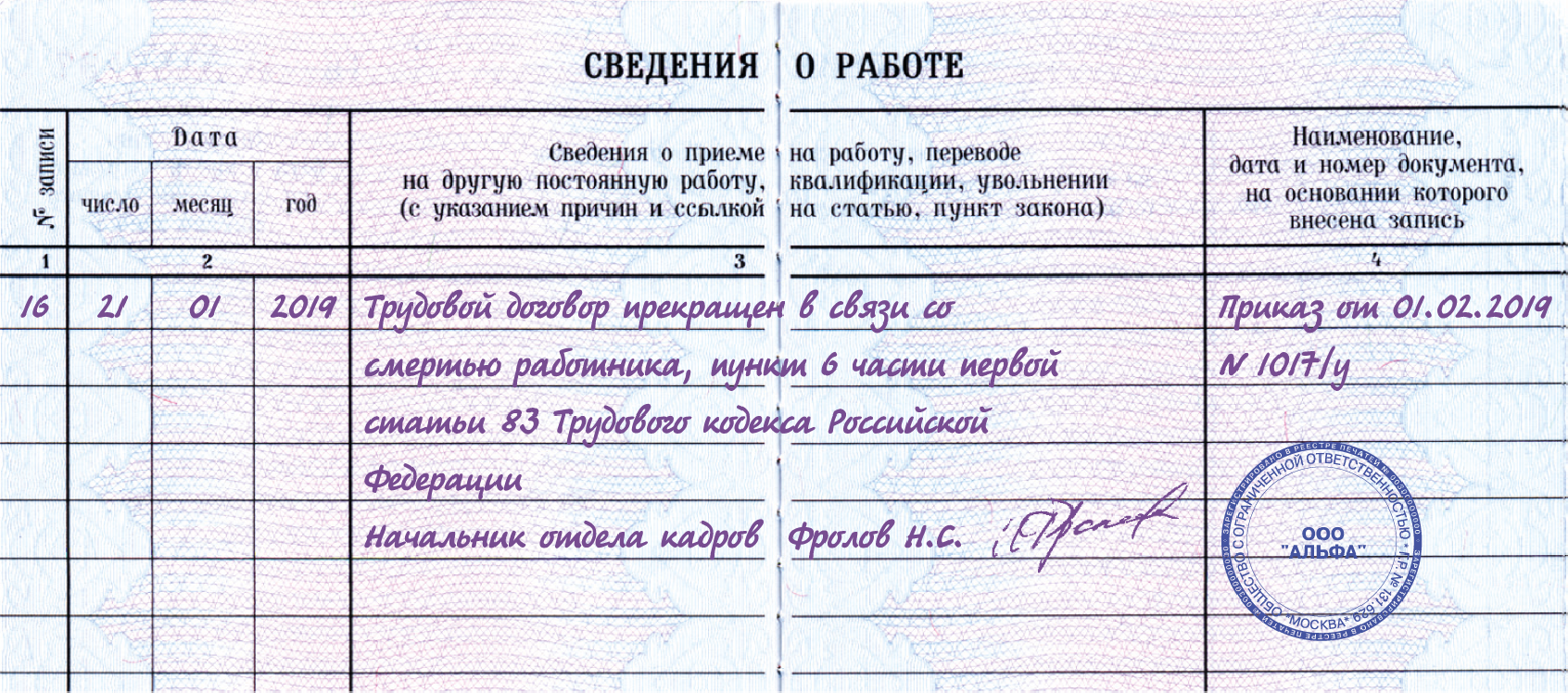 Как внести в трудовую книжку запись об увольнении в связи со смертью