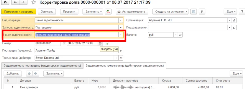 В некоторых случаях контрагентом могут выступать отдельные компании, у которых один владелец. Например, офисные столы были реализованы одной организацией, а услуги по ремонту оказывались другой, взаимозачет возможен при условии, что их хозяин согласен на проведение операции. Работа с документом будет практически полностью дублировать стандартный вариант. Главное отличие состоит в том, что в графе «В счет задолженности» указывается «Третье лицо перед нашей организацией».