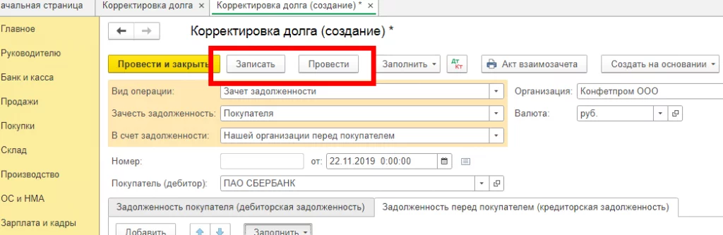 По завершении ручного редактирования сумма задолженности должна быть сохранена. Пользователю необходимо последовательно кликнуть на две кнопки – «Записать» и «Провести».