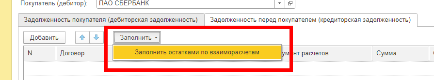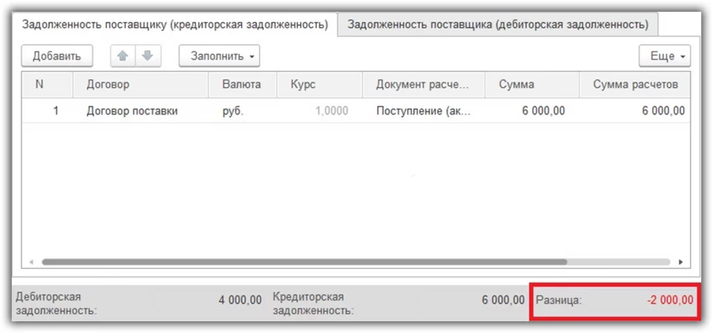 В форме по созданию взаимозачета расположено две вкладки, одна из которых содержит информацию по дебиторской задолженности (долг, который необходимо заплатить поставщику), а вторая – по кредиторской (собственной).